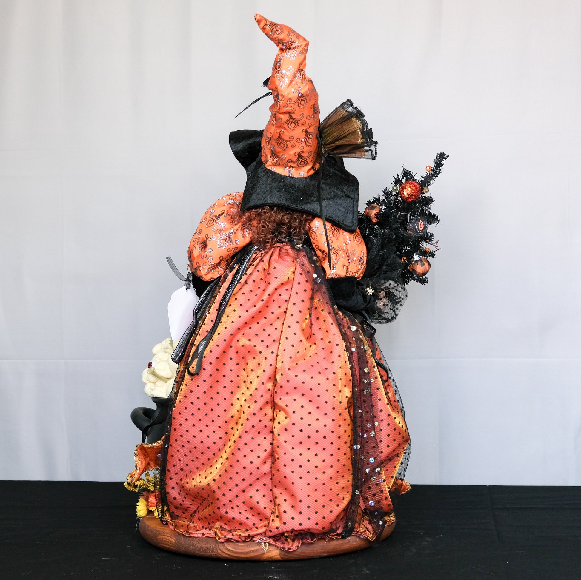 The Something Brewing Witch figurine captures the essence of Halloween. She is wearing a vibrant orange dress and standing next to a cauldron bubbling with magical potions. Holding her spooky Halloween tree, this detailed piece brings mystical charm to your seasonal decor. Perfect for showcasing a spooktacular Halloween and whimsical vibes, it’s a must-have for creating an enchanting display.